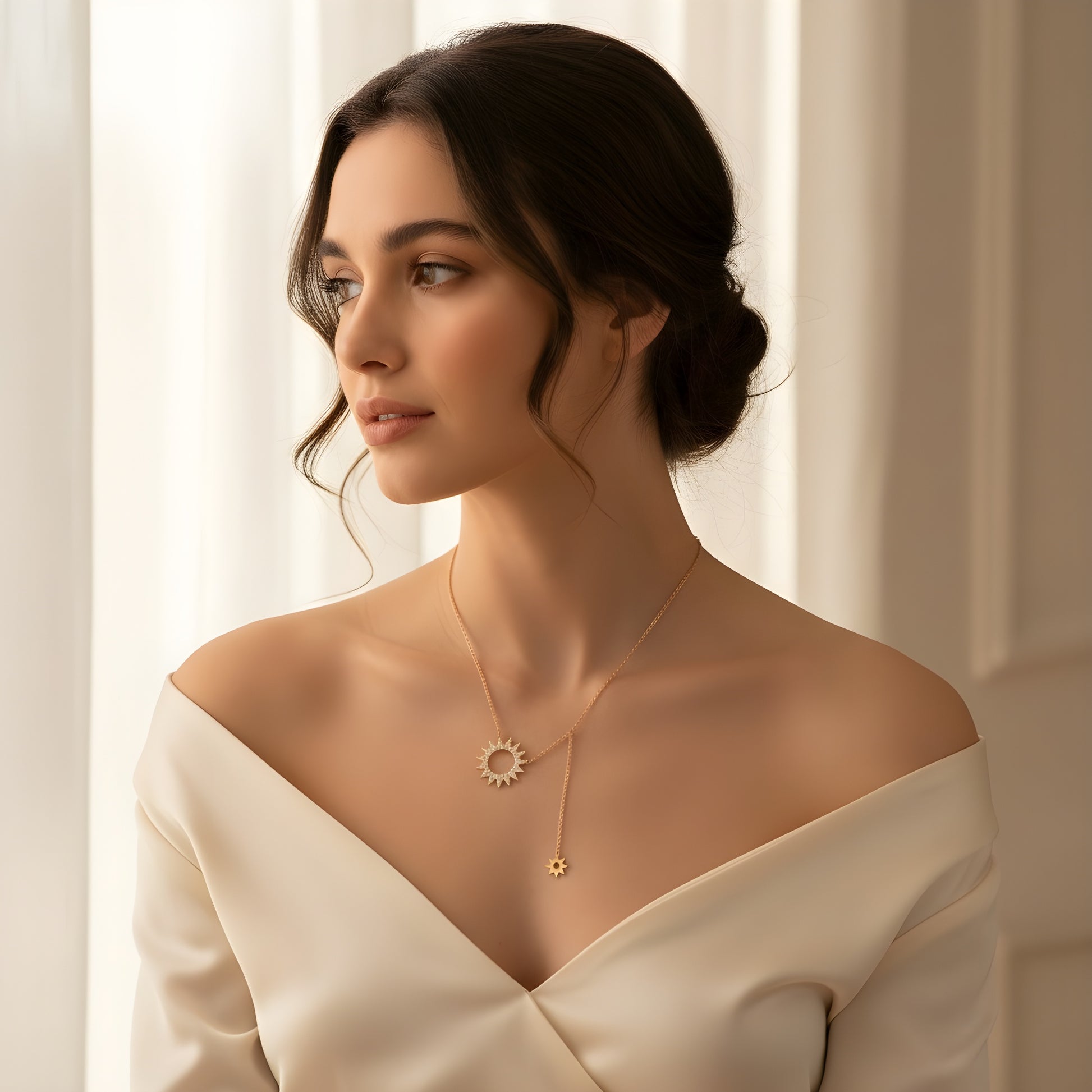 Embrace light and shadow with our Sun & Star Y-Necklace Designed in gold-plated S925 sterling silver, this celestial piece features a radiant sunburst and a dangling star — evoking harmony, contrast, and cosmic elegance.